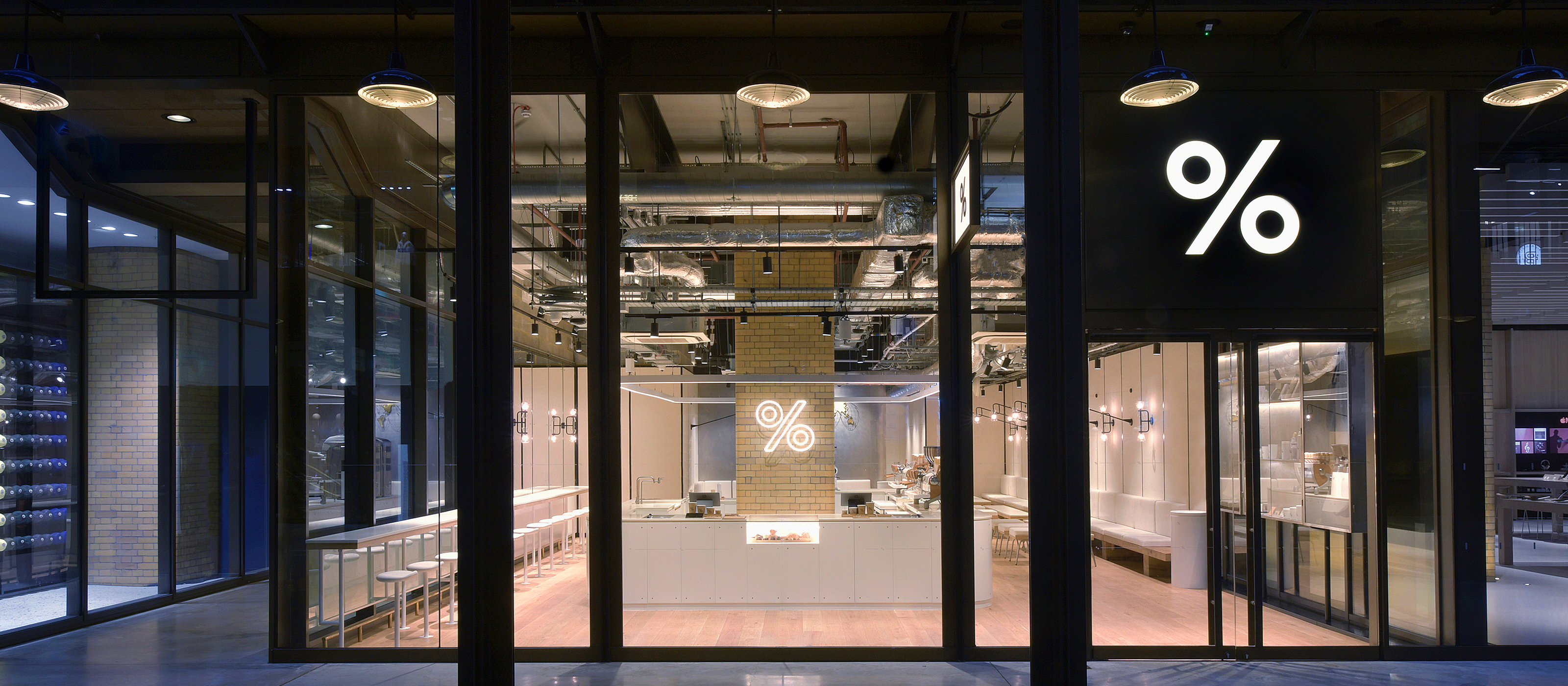 The store is organized with a modular sequence of wall paneling, inspired by the former technical cladding of BPS’s control room, but reinterpreted with a change in material. Crafted from felt, to introduce a surface that will both capture light and diffuse light as well as help as an acoustic correction, contributing to a soft and welcoming atmosphere. The floor is continuous all over the seating areas and done with a stack-bond wood floor pattern, hinting at the site’s industrial past. A suspended % neon sign centered in front of the brickwork column highlights the location’s historic past. For the design, we aimed for simplicity, maximum transparency and centrality.”