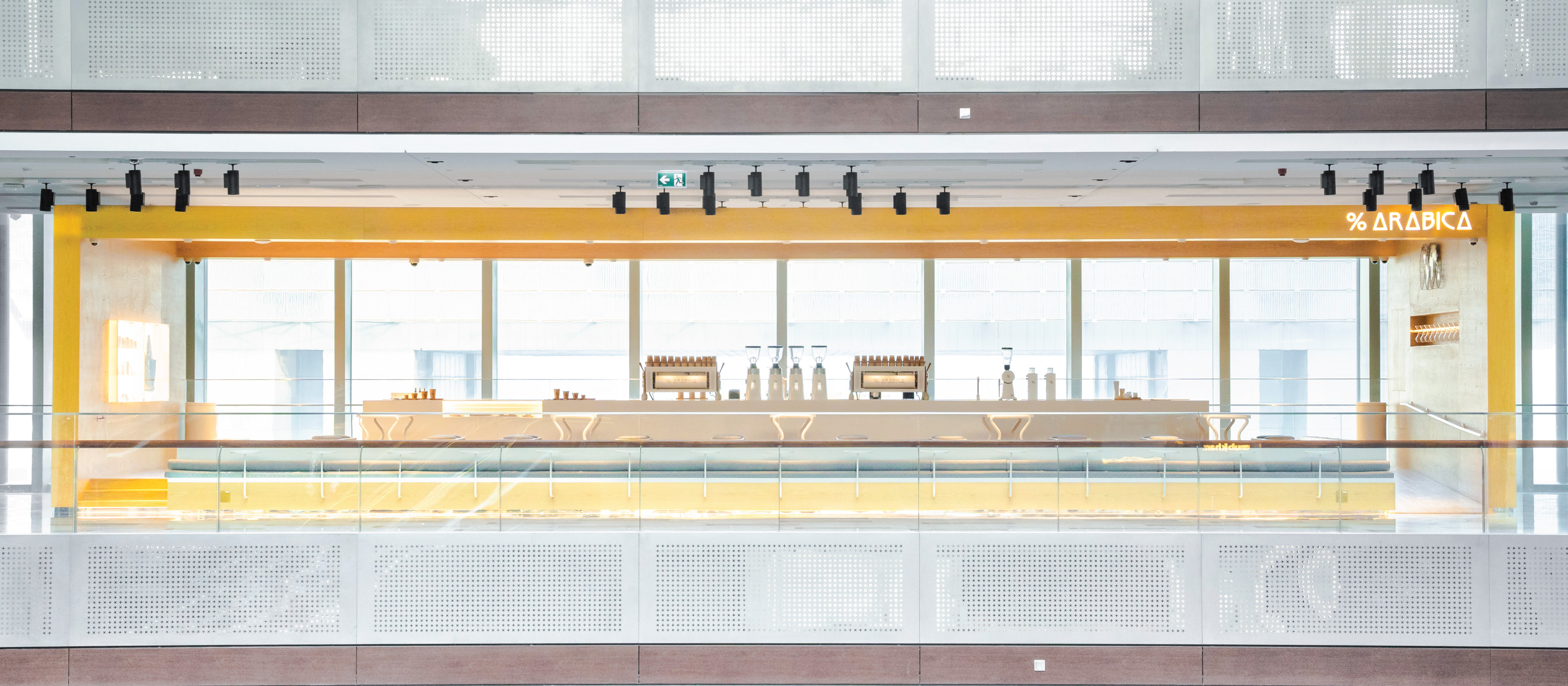 “This % ΔRΔBICΔ store in The Galleria aims to create a framed view or window within the mall corridors, allowing visitors to observe the coffee-making process as if they were viewing a piece of art. This innovative design provides an experience where shoppers can take a moment to relax, converse, and savor a freshly brewed cup of coffee. While admiring the view, people-watching becomes part of the living scenery, enhancing the overall ambiance of the mall.