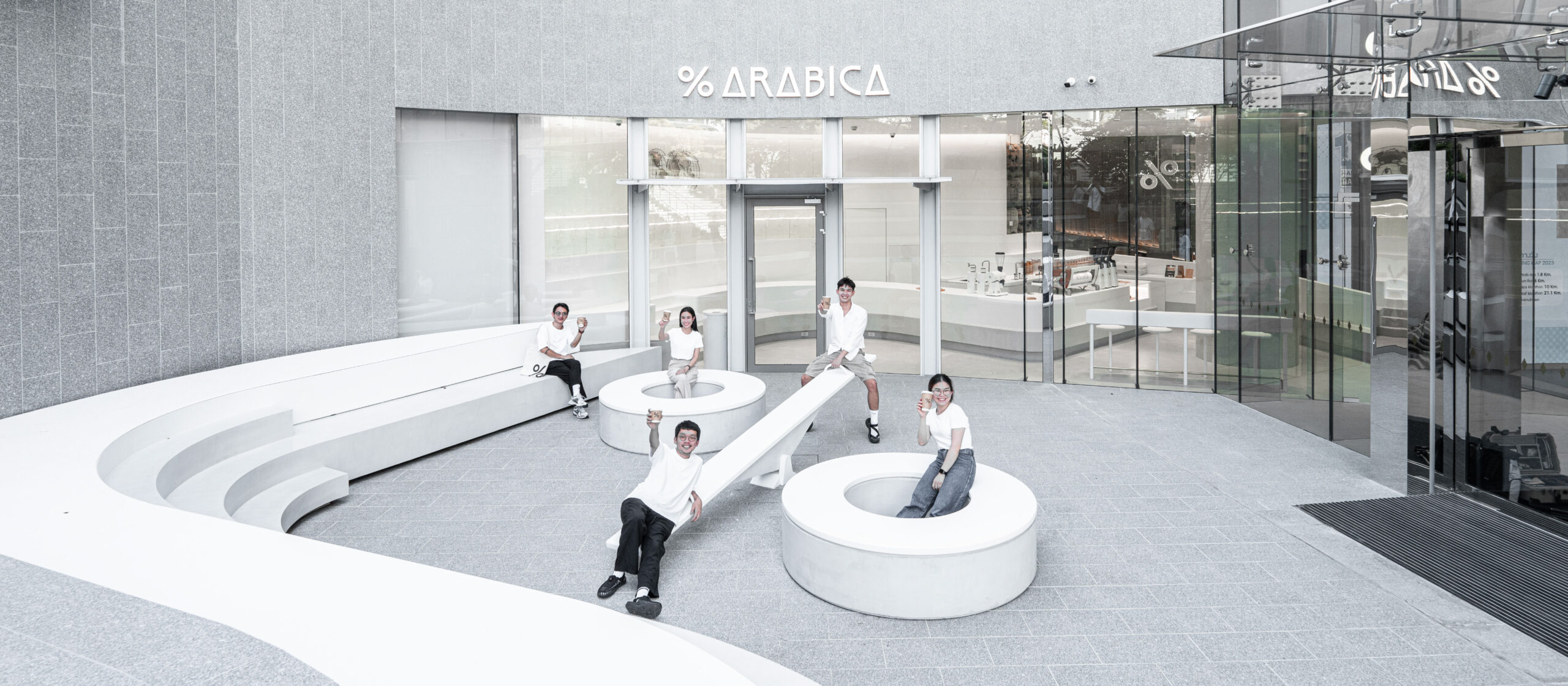 Our store is located at the pocket end of QSNCC’s lower main grounds. Adopting the amphitheater’s smooth contours to the outdoor seating area, our design partner M.L.K.K created a space that mirrors the dynamic outside. Sheerly bounded by glass walls, the outdoor seating steps seamlessly flow to the inside of the store as a counter. Adding a splash of fun, just right before the entrance is a see-saw modeled from our % logo.