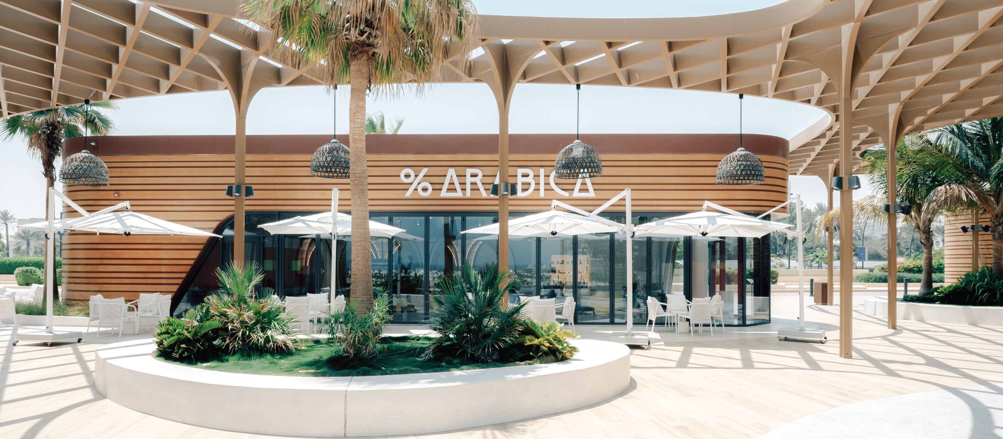 The iconic % Arabica x Studio Precht kiosk adds a lively touch to the interior, with acrylic materials that appear especially clear and ethereal in this unique light. Seating zones avoid the usage of rigid barriers and utilize lush tropical plants to create semi-private enclaves. Enhancing experiential continuity from the beach to the store, the curated chair selection prioritizes ergonomic comfort, with textured fabrics enticing tactile engagement as guests settle in. The coastal-inspired color palette desert gold echoing the beach, ocean blue mirroring the Gulf, and accents of date palm green extends to these seating pieces, creating a bright and welcoming atmosphere that hopes to evoke a seamless harmony between the vibrant coastline and modern hospitality.”